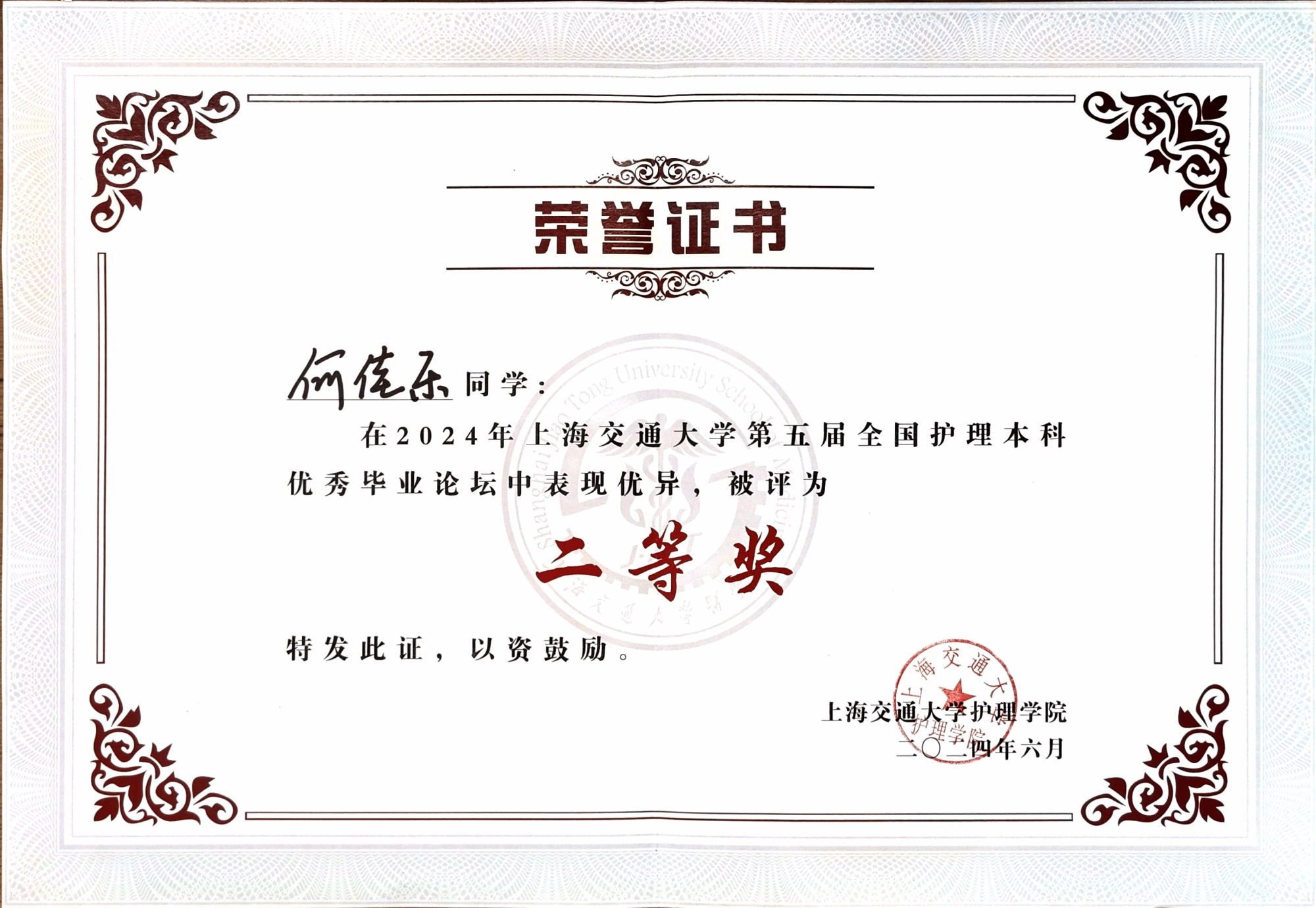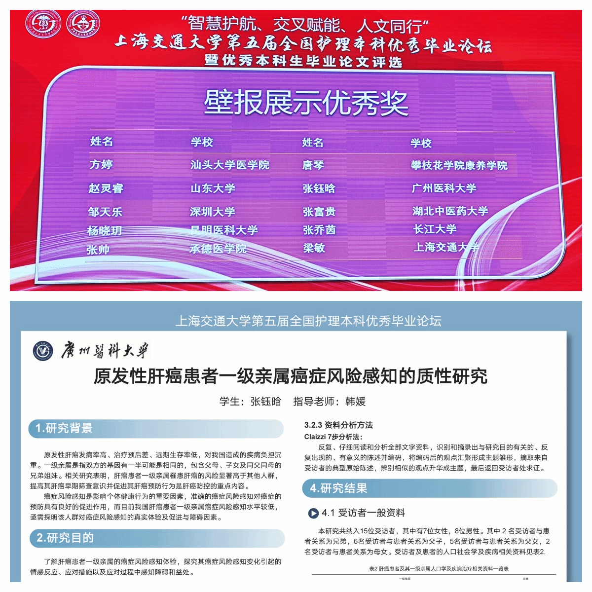 我院2020级护理本科生何佳乐的毕业论文《人际关系对青少年心境障碍住院患者非自杀性自伤的影响》(指导教师:高云副教授)荣获口头汇报二等奖;2020级护理本科生张钰晗的毕业论文《原发性肝癌患者一级亲属癌症风险感知的质性研究》(指导教师:韩媛副教授)荣获优秀壁报奖。