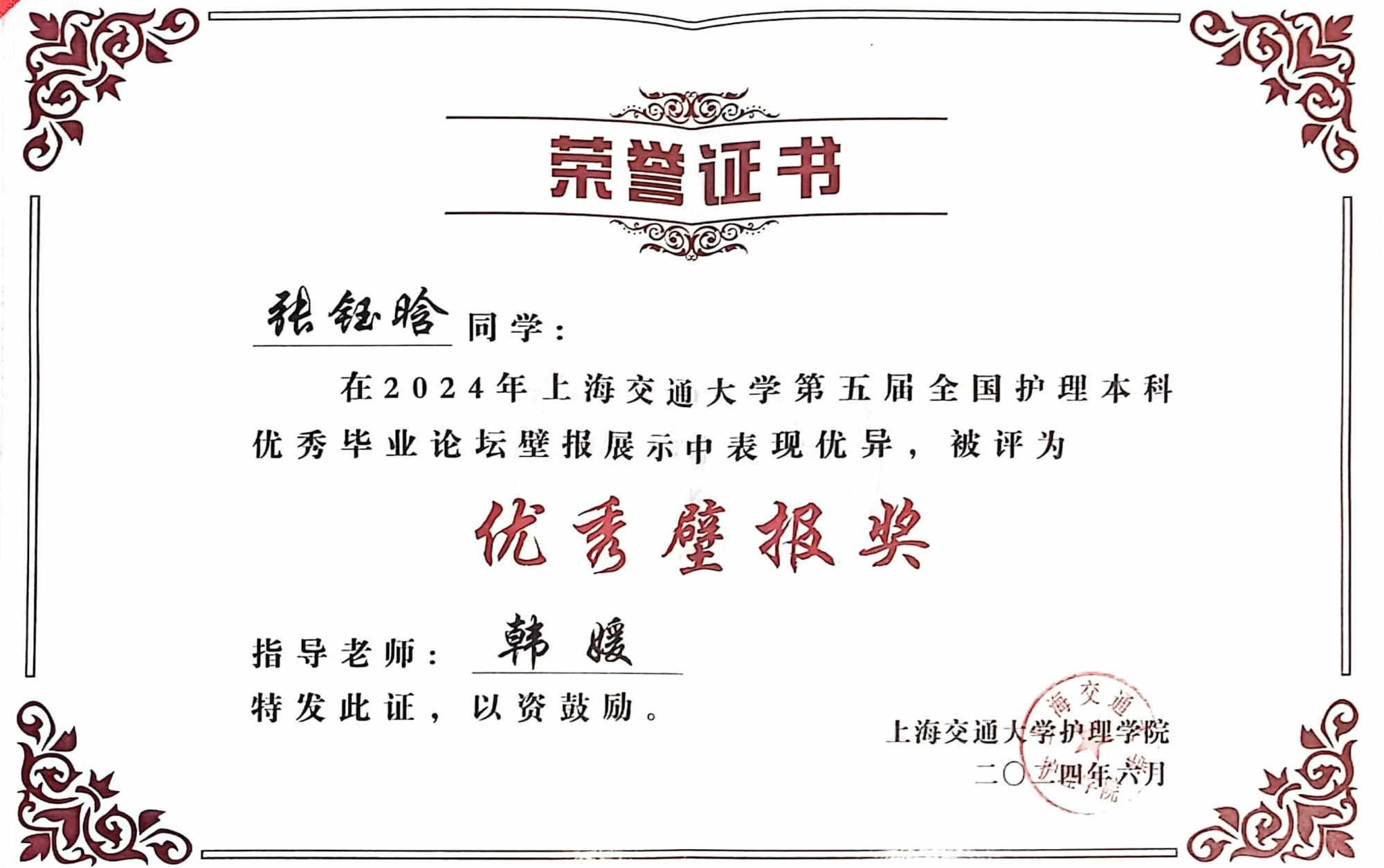 张钰晗同学获第五届全国护理本科优秀毕业论文优秀壁报奖