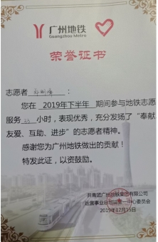 郑明峰荣获广州地铁集团颁发的荣誉证书