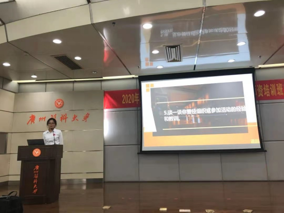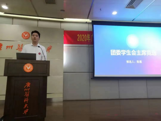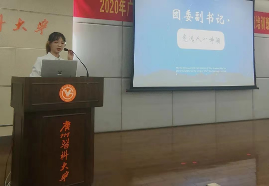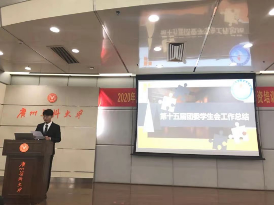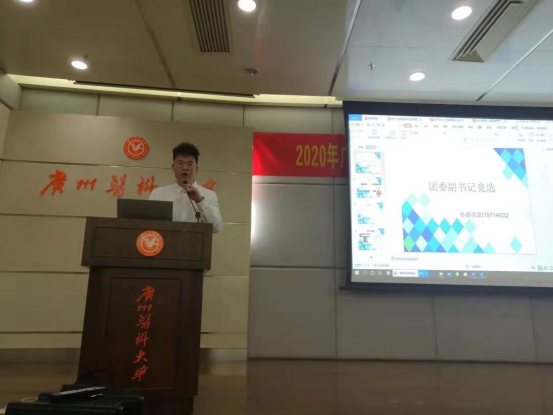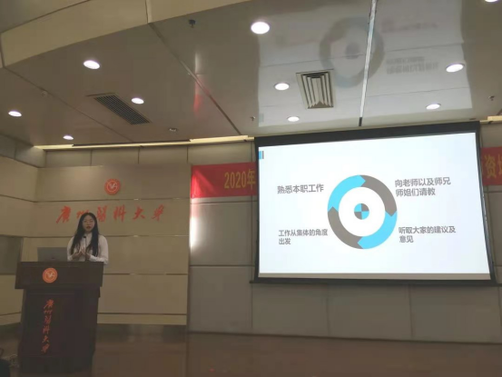 结束候选人的展示环节后,接着是学生会主席董岩作2019-2020学年团委学生会工作总结及欧丽娅主任为新委员董岩、代思迪、王志豪、陈旭璇发放聘书。