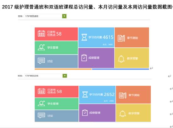 护理专业学生94人;疫情期间也可供广大临床医学专业、护理学专业、临床医生、护理人员在线学习。开课3周以来,课程总访问量达7267次,本月访问量达5689次,本周访问量达1948次。学生学习积极性高,通过qq群、学习通等多种工具参与在线授课活动,已发布任务点58个、案例分析讨论话题14个、参与讨论783人/次;发布中文课前、课后测试13次、英文测试题1次,参与学生比例超过90%。