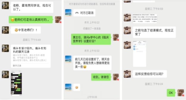 取得联系,利用对方学校的国家虚拟仿真实验教学课程资源《传染病护理思维技能一体化虚拟仿真实训项目》解决了相关课程的实践教学困境;多门课程积极利用如南京中医药大学的《中医护理学》等国家精品在线开放课程,拓宽了学生的学习途径;多个教研室利用微信视频会议开展新教师试讲,确保了教学质量(图2)。通过全体教师的不懈努力,我院护理学在线课程迅速增长到21门。