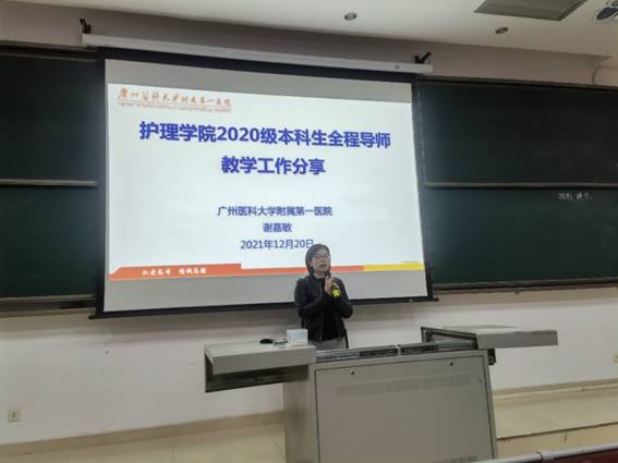 来自附一院老年科的谢嘉敏老师作为导师代表对上一年度的导师教学工作进行了经验分享,她从线下线上活动、学生想跟老师说的话、新年展望三个方面进行介绍,她认为通过组织学生参观抗疫纪念馆,让学生参与制作抗疫展览视频、写通讯稿、做PPT,这样既锻炼学生的能力,也培养学生职业认同感。此外,她还分享了自己如何组织读书分享会、带领学生参观校园环境等多种形式的活动经历,对自己过去一年所做的工作进行了一一介绍。
