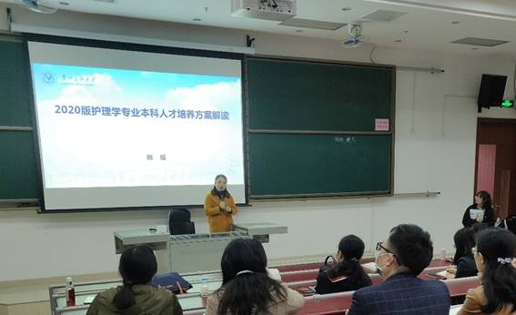 紧接着教研办韩媛主任以《2020版护理学专业本科人才培养方案解读》为题,结合导师任职要求,进一步对我校人才培养目标定位、护理学专业课程计划等作了详细介绍,并结合上一年自己作为导师如何引导学生选课、追踪学生学业成绩的做法,再次强调了本科生导师的工作职责。
