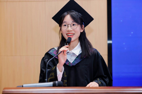 本科生毕业生代表陈希楠同学以一粒种子的成长为喻,分享了自己在大学四年的学习与成长经历,她动情地说:“我们就像一粒粒种子,在广医这片沃土中汲取养分,如今即将破土而出,去创造属于自己的精彩。”她感谢老师们的辛勤教导和同学们的陪伴支持,祝福同学们带着“破土”的勇气与信念,在未来的道路上绽放独特光芒。