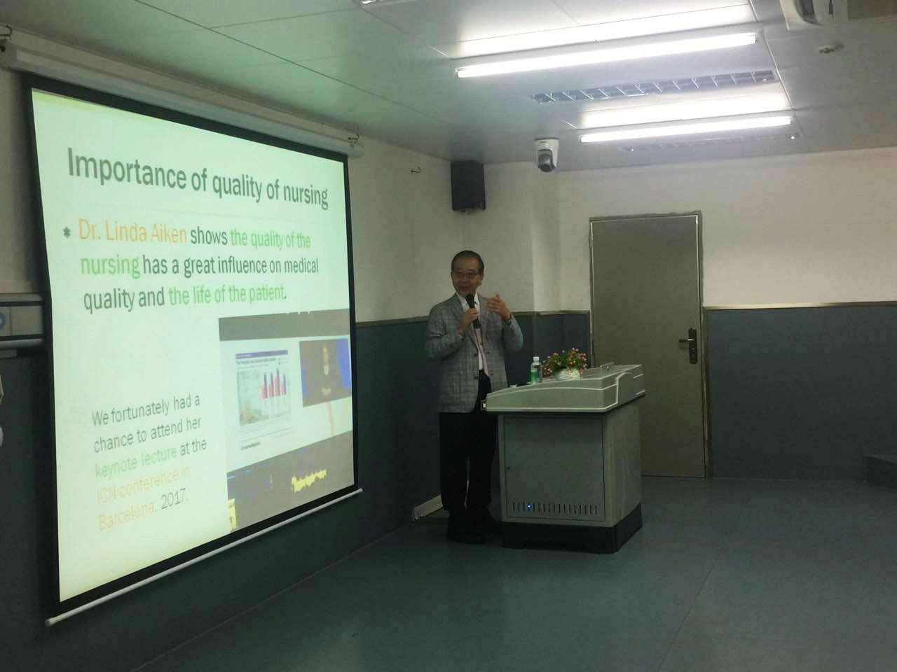 三位教授举行了4个专题讲座,内容涵盖病人尊严研究、日本护理教育介绍、医院风险管理、老人缓流康复护理和居家养老,与会者积极踊跃回答提问。太田腾正教授对病人尊严领域的系列研究设计严谨、数据详实、开发的病人尊严量表具有良好的信效度;汪国成教授的演讲深入浅出、诙谐幽默,引发阵阵欢笑声,他还针对当前我国人口快速老龄化的现况,结合香港积累多年的养老经验,将中西方的养老理念有机融合,令大家深受启发;苏思弦博士介绍了香港医院进行风险管理的理念、举措等,使临床护士获益匪浅。该讲座拓展了师生的学术视野,增进了与香港及日本同行之间的相互了解。在汪国成特聘教授的建议之下,我院与太田腾正教授商讨了在病人尊严领域开展科研合作的可行性,双方达成联合进行科研的共识。